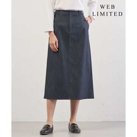 ストレートシルエットで仕上げた、ナロースカート。ウエスベルトの前タブには調節可能なJ.PRESSロゴ入りのドット釦を使用し、さりげないアクセントに。前後に長めのダーツを入れることで、腰回りをすっきりと見せています。後ろウエストはゴム仕様で穿きやすく、動きやすさも兼ね備えたデザインに仕上げました。タイトめのシルエットながら、後ろにベントを入れることで、脚さばきも快適です。デニム調素材なのでオールシーズン着用でき、トップスを変えるだけでシーズンレスに着回しを楽しめます。カラーはインディゴ見えのネイビー(#075)と、春らしいグレー(#003)の2色展開です。