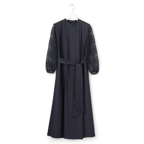 華やかなレース袖デザインが印象的な素材コンビドレス。フロントにタックディテールを効かせたノーブルなデザインはそのままに、袖部分に新しい上品なレースを使用しアップデート。またボディと共生地を使用したリボンは、ウエストベルトとしても、後ろ襟元チェーンコードに通してボウタイのようにもお楽しみいただける仕様です。エレガントな洒落感が漂うブラウン(#030)と、清楚な気品を感じるネイビー(#075)の2色展開です。