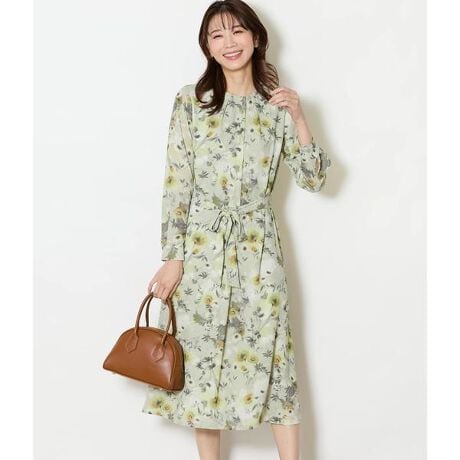 明るく光り差す草花のコントラストや、春かすみのような柔らかさを表現した、オリジナルプリントが魅力。衿ぐりにタックを入れたクラシカルで上品なデザインは、ジャケットやカーディガンなどとの羽織りとも好相性。付属の共地リボンを結ぶことでメリハリをプラスできます。裏地あり。ポケットなし。