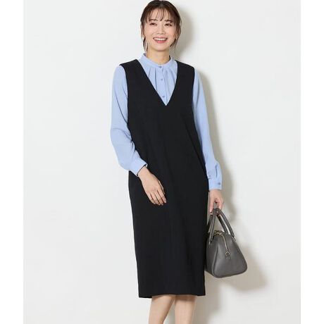 ストンと落ちるストレートシルエットに、シャープなVネックを組み合わせたジャンパースカート。ブラウスやニットを重ねれば、テクニック要らずできちんと感のあるレイヤードスタイルが完成します。脇ポケット付きで実用性もあり、オフィスシーンからきれいめなお出かけまで対応できる一着です。裏地あり。ポケットあり。