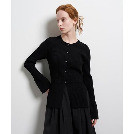 フロントのランダムなボタンが印象的なリブカーディガン。ボタンは部分的にLANVINのモチーフでもある、欠けたハート型になっている。長めの着丈がモードな印象で、ボトムともバランス取りやすく、袖口に向けて広がるカフスは腕のラインや手元を美しく魅せてくれる。