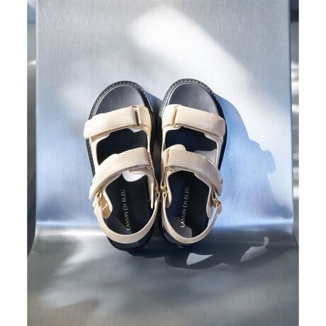 ダブルベルト仕様でしっかりとホールド。面ファスナーのストラップでフィット感の調整が可能です。ワントーンのカラーリングに、ゴールドのロゴチャームが上品なアクセントを添えています。程よくボリュームのあるソールが印象的で、モードカジュアルなスタイルを引き立てる一足です。