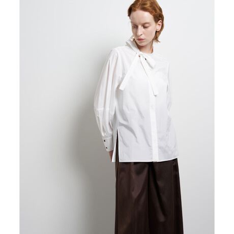 タイはややサイドに結ぶことで、品よく柔らかな雰囲気に。立体感のあるランタンスリーブがモードなバランスを生み、比翼仕立てのミニマムな前立てが洗練された表情を演出します。