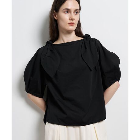 肩で結ばれたリボンが目を惹き、顔周りを華やかにしてくれるトップス。