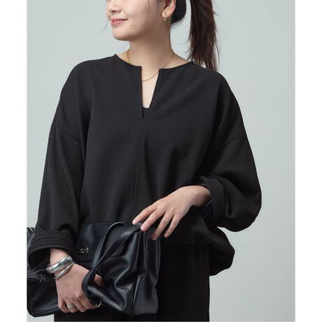 程よい深さのキーネックラインが、お顔周りをスッキリと知的な印象に見せてくれるブラウス。 身体のラインを拾わないリラクシーなワイドシルエットながら、落ち感のある素材を使用することで、カジュアルすぎない洗練された印象に。