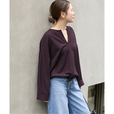 程よい深さのキーネックラインが、お顔周りをスッキリと知的な印象に見せてくれるブラウス。 身体のラインを拾わないリラクシーなワイドシルエットながら、落ち感のある素材を使用することで、カジュアルすぎない洗練された印象に。
