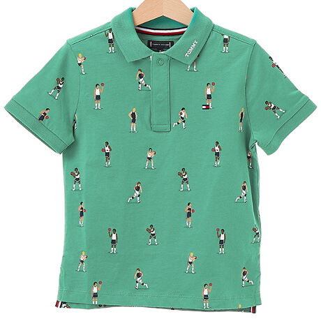 バスケットボールプレイヤーたちを総柄デザインにした、ユニークなプリントポロ。バスケットボール好きのキッズが喜ぶ一枚は、コーディネートの主役になる存在感です。襟と前立て、袖口は無地で切り替えて、襟もとに「TOMMY」のロゴを、左胸もとにフラッグロゴを刺繍しました。裾は前後差があり、サイドスリット入りです。