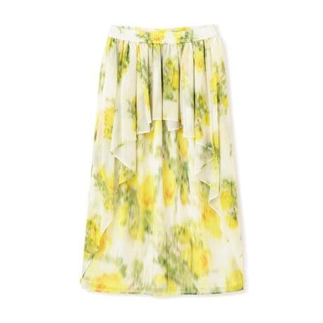 華やかなイエローの花柄がプリントされたギャザーコクーンスカート。
