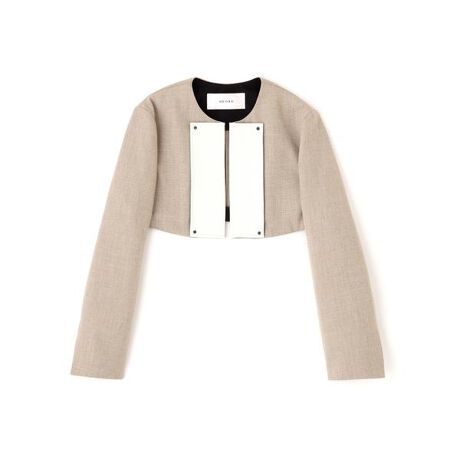 ミドリフ丈のショートジャケットで折り返されてあえて裏面を見せた前立てと端にさりげなくあしらわれたドット釦がポイントです。