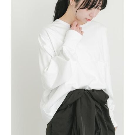 太番手のしっかりとした肉感のカットソー。シルケット風加工を施し、カジュアルすぎないデザインに。前がドルマン後ろはラグランの変形デザイン。オーバーシルエットですが程よい丈感ですっきりしており、ボトムに合わせやすいサイズ感になっています。前の切替にポケットがあり、ポケット下にさり気なくロゴ刺繍を施しているのがポイントです。春らしいカラー展開でコーデに足すと一気にシーズンムードがあがります。1枚着はもちろん、オーバーシャツにINしたり1枚持っていると重宝するカットソーです。