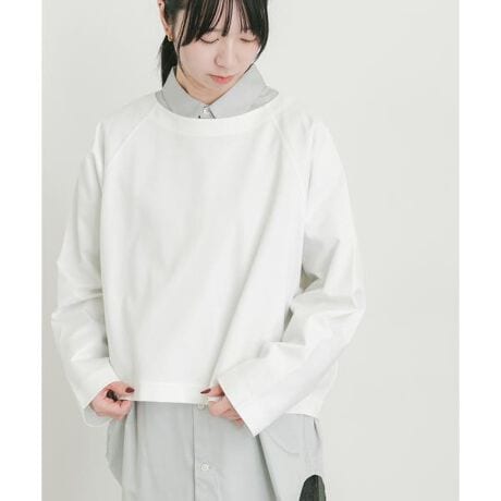 表に細番手のコットンを使用し、裏にポリエステルを使用したポンチ素材。シルケット加工を施し表面感を綺麗に仕上げました。程よいボートネックと丸みのあるシルエットで女性らしいさを出しました。後身頃にタックを施し、前だけインしてもオーバーで着用しても様になるデザインとなっております。UVや接触冷感機能もついており春夏に嬉しいアイテムです。