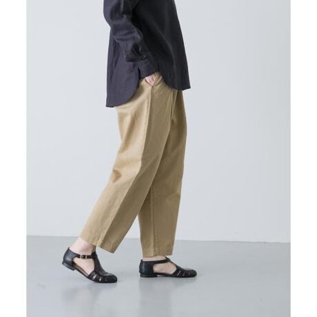 着こなしに奥行きを生むイージーパンツ。生地は太番手の綿にリネンがブレンドされたカツラギ素材を使用。程よい股上の深さと裾に向かってテーパードしたデザインが存在感を高めています。ウエストは総ゴム+紐付きの仕様。全体的にゆとりがあり楽な着心地なので、デイリーに活躍するおすすめの一品です。