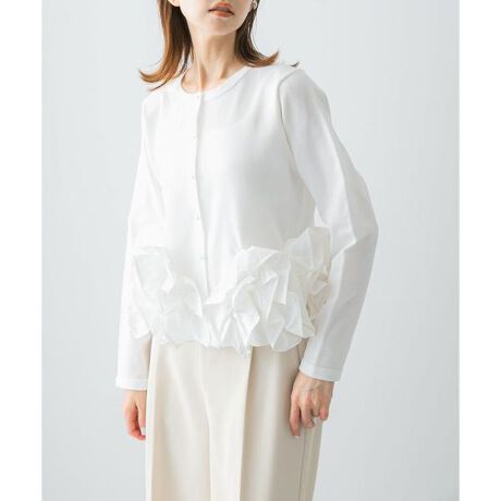 再販希望がやまない、Mewlの大人気カーディガン。ポリエステル糸で編み上げた、さらりと軽やかな着心地。裾にはたっぷりとあしらわれたフリルが、まるで花びらのようにふんわり揺れて、目を惹くデザインに。ボタンには上品なパール調を使用し、甘さの中に凛とした印象もプラス。季節を問わず活躍してくれる、着映え力も頼れる一着です。カジュアルにもキレイ目にも着られる優秀アイテム。