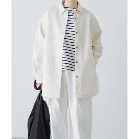 刺し子のようなステッチを施し、ポコポコとした表面感が特徴のドビー生地を使用したシャツジャケット。コットン100%なので天然素材ならではの穏やかな雰囲気が感じられます。気温が上がってきたら日々の着こなしに取り入れたいアイテム。さっと羽織るのに便利で、ボタンを上まで留めてトップス風に着こなすのも素敵ですよ。左右についたポケットもポイントで、メンズライクなオーバーサイズが抜け感を生んでいます。きれい目なスカートとのスタイリングもおすすめ。