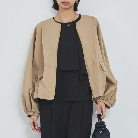 上品なミニマルデザインとゆったりシルエットが魅力のノーカラーブルゾン。ドロップショルダーとふんわりとしたバルーンスリーブ、裾と袖口のギャザーで女性らしい丸みのあるシルエットを実現。フロントにさりげないフラップポケットとスナップボタンのディテールを備え、機能性も確保しています。薄手で軽やかな素材感は季節の変わり目の織りに最適です。