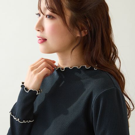・襟・袖・裾をメローステッチで仕上げた、華奢で女性らしい印象のボトルネックデザイン