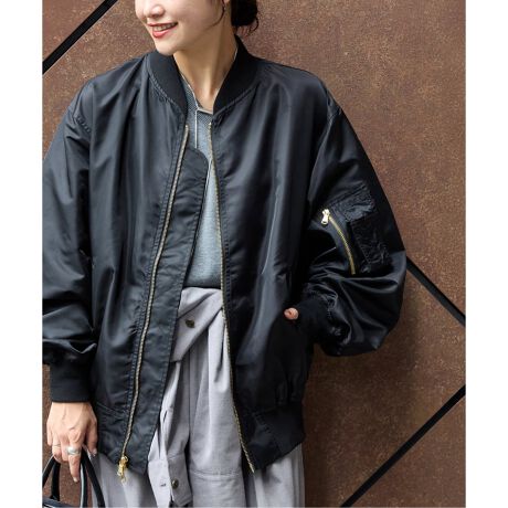 ヒップが隠れるゆとりのあるシルエットと、ほど良い光沢感、しなやかさのある素材感で大人の女性も着やすいMA-1。