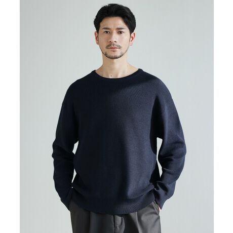 シンプルなディティールのニットだからこそ、シルエットで差が付くようこだわって設計しました。窮屈感がない程度にはゆとりを持たせつつ、オフィスでも着られるくらいのきちんと感のあるサイジングに。トレンドに左右されることもなくお洒落な着こなしが楽しめる、ちょうどよい大人のゆったりシルエットを実現しました。