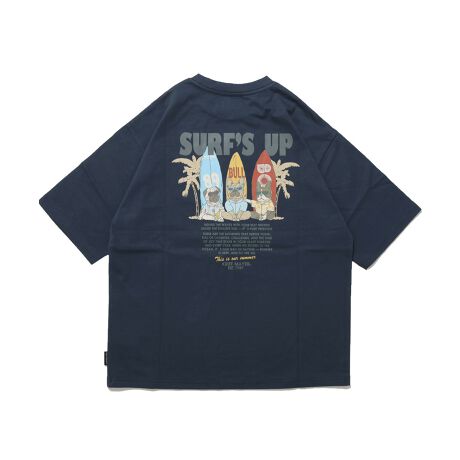 鼻ぺちゃワンちゃんの三大巨頭「パグ」「フレンチブルドッグ」「ボストンテリア」が趣味のサーフを仲間と楽しむグラフィック。