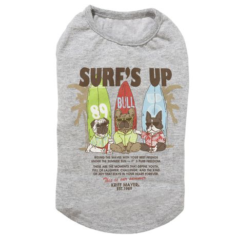 鼻ぺちゃワンちゃんの三大巨頭「パグ」「フレンチブルドッグ」「ボストンテリア」が趣味のサーフを仲間と楽しむグラフィック。