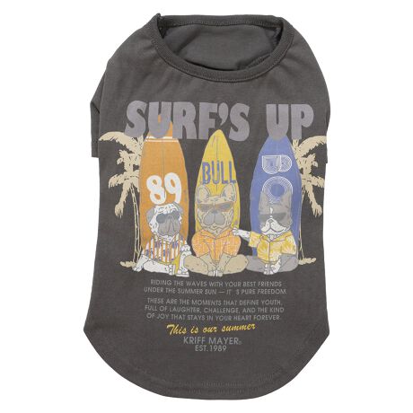 鼻ぺちゃワンちゃんの三大巨頭「パグ」「フレンチブルドッグ」「ボストンテリア」が趣味のサーフを仲間と楽しむグラフィック。