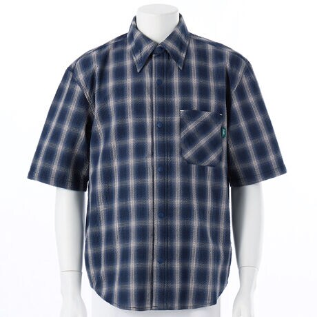 肌に張り付きにくい凹凸感が特徴の、シアサッカーチェック素材を使用したスナップボタンシャツ。