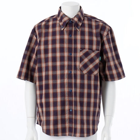 肌に張り付きにくい凹凸感が特徴の、シアサッカーチェック素材を使用したスナップボタンシャツ。