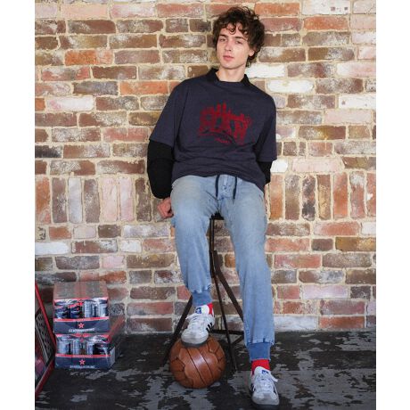 長い期間穿き込んだような自然なアタリ感を表現しつつ、左ポケット付近に配したワンポイント刺繍が、さりげないアクセントになっています。