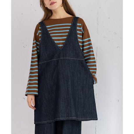 スクエアネックがどこか懐かしい印象の、デニム素材のオーバーベスト。深めのカッティングで、インナーを合わせても子供っぽくならず、すっきりと着こなせます。前後2WAY仕様で、Vネック側を前にした着用も可能。切り替え下にはフレアを入れ、ミニドレスのような雰囲気でも楽しめます。10オンスのデニム生地を使用し、薄手で軽やかな着心地も魅力。着こなし次第でさまざまな表情を見せてくれる、レイヤードが楽しい一枚です。