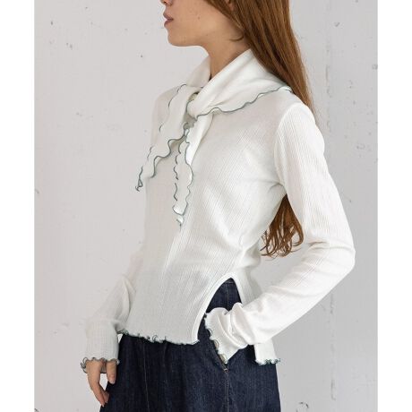 首元をすっきりと見せる、緩やかなスクエアネックが印象的なデザイン。柔らかく伸縮性のある、着心地の良いリブ素材を使用しました。すっきりとしたシルエットながら程よいゆとりがあり、ボディラインを拾いにくいのも嬉しいポイント。左脇にはさりげなくスリットを施し、動きやすさと抜け感をプラス。同素材のスカーフは単品使いも可能で、オン・オフ問わず活躍するワードローブの心強い一枚です。
