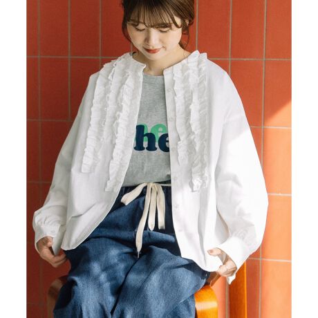 フロントのフリルデザインが華やかなシャツ。高密度のシャツ素材を使用し、きれいめな印象に仕上げました。フリル端は断ち切りにしてラフさを出し、ランダムに縫い付けることで甘さを抑えたカジュアルな雰囲気に。衿元は控えめなスタンドカラーですっきりと着られ、羽織としても活躍します。