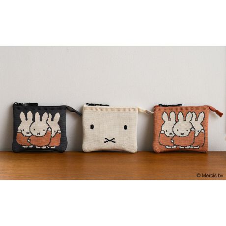 ミッフィーの絵本のワンシーンがデザインされたニットフラットポーチ。背面にはMIFFYのロゴ入り。コスメや小物の収納にぴったりです。箱入りでギフトにもおすすめ。