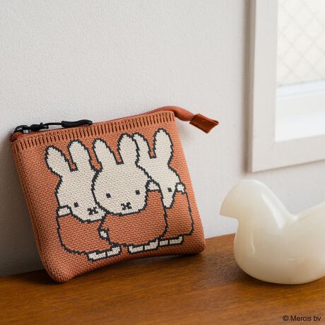 ミッフィーの絵本のワンシーンがデザインされたニットフラットポーチ。背面にはMIFFYのロゴ入り。コスメや小物の収納にぴったりです。箱入りでギフトにもおすすめ。
