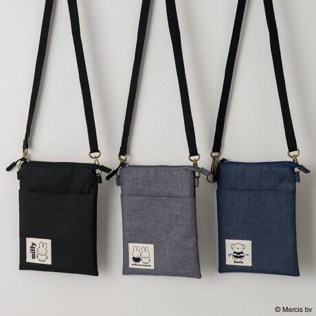ミッフィーやボリスのプリントネームがポイントのショルダーポーチ。落ち着いた色合いでコーディネートに合わせやすいデザインです。内ポケット、フロントポケット付きで荷物を整理しやすいのもポイント。