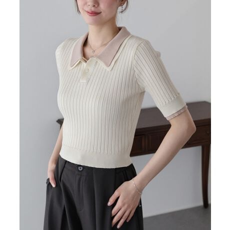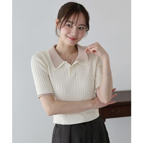 配色のレイヤード襟デザインがトレンドライクな半袖ポロニット