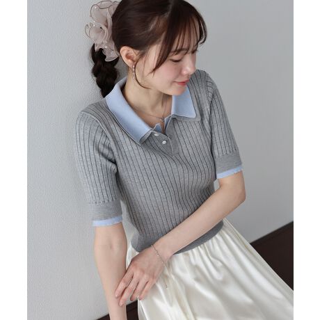 配色のレイヤード襟デザインがトレンドライクな半袖ポロニット