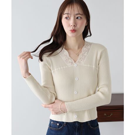 シンプルなニットにレースで甘さをプラスしたレースドッキングVネックニット