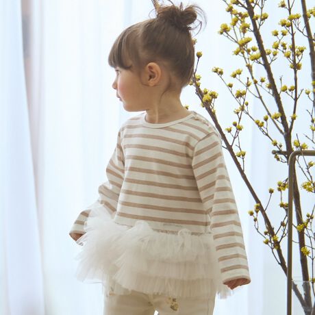 チュールをたっぷりと使った可愛らしいペプラムデザインが魅力の長袖Tシャツです。