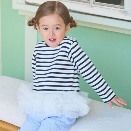 チュールをたっぷりと使った可愛らしいペプラムデザインが魅力の長袖Tシャツです。
