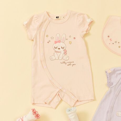 mimiちゃんのアップリケ刺しゅうが入った、パフスリーブが可愛らしいショートオール。