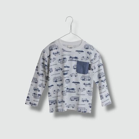 子どもたちの憧れの乗り物がいっぱいにプリントされた総柄と、