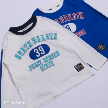 スポーティな袖ラインプリントにカレッジ風ロゴデザインの長袖Tシャツです。