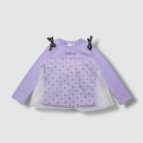 肩のロゴ入りリボンと、ふんわりチュールを重ねた胸からの切替デザインがキュートな長袖カットソーです。
