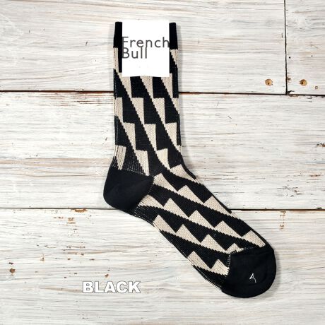 幾何学柄のジャガード編みのソックスです。ベースはガス焼処理により毛羽を抑えたシルケットの綿糸で、程よい厚みに編み立てました。シャープな柄と配色が目を引き、鮮やかなカラーは差し色としても。カジュアルスタイルに合わせやすい1足です。