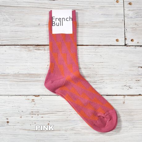 幾何学柄のジャガード編みのソックスです。ベースはガス焼処理により毛羽を抑えたシルケットの綿糸で、程よい厚みに編み立てました。シャープな柄と配色が目を引き、鮮やかなカラーは差し色としても。カジュアルスタイルに合わせやすい1足です。