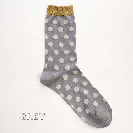 TOPに施したラメがポイントのシンプルなドット柄のソックスです。毛羽の少ないスーピマ綿をベースに薄く編み立てました。大きすぎないドット柄がいろんなスタイリングに合わせやすい1足です。