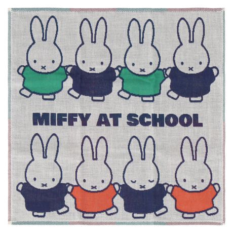 ミッフィーとがっこうのお友だちが仲良く並んだ3重ガーゼハンカチ。