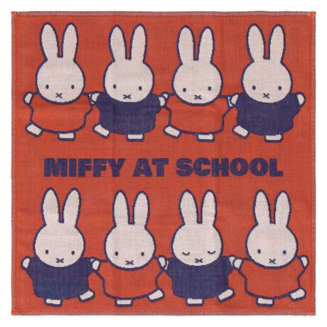 ミッフィーとがっこうのお友だちが仲良く並んだ3重ガーゼハンカチ。