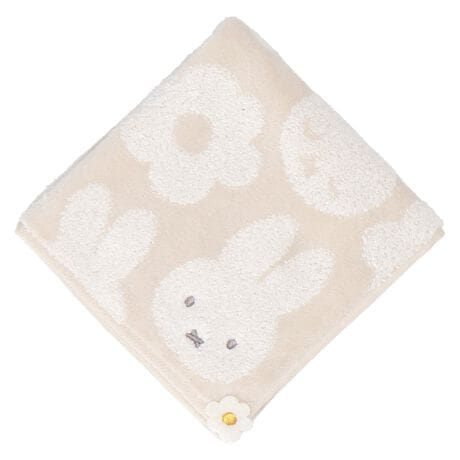 ミッフィーとお花の総柄がかわいいタオルハンカチ。ふんわりした肌触りとやさしい色合いがマッチした一枚です。お花のアップリケ刺?もポイント。