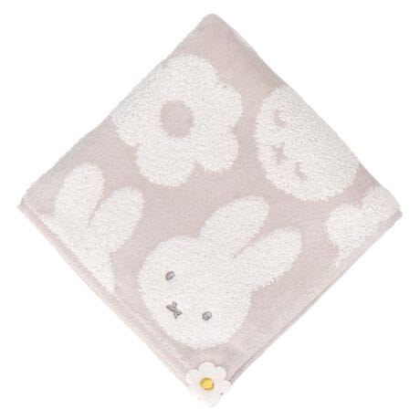 ミッフィーとお花の総柄がかわいいタオルハンカチ。ふんわりした肌触りとやさしい色合いがマッチした一枚です。お花のアップリケ刺?もポイント。